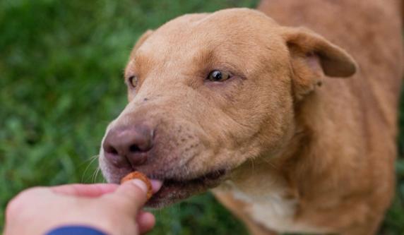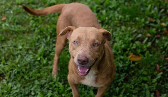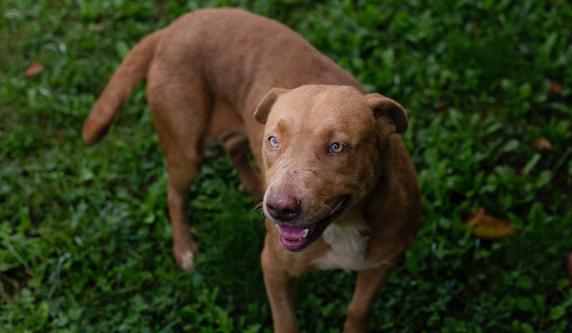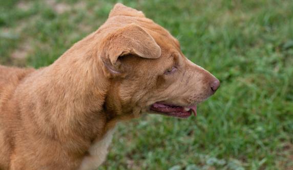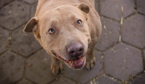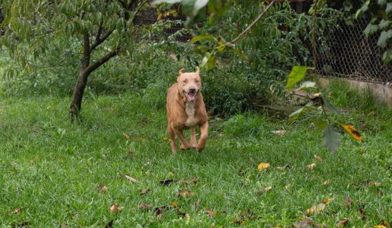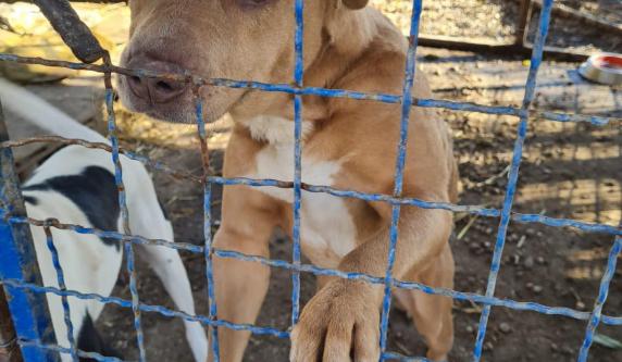 ROSE 122970 female, 20.3.2020., in the shelter since 1.9.2021., from Roma village, very nice, dear, happy girl. She likes atention and is very happy when you come to her cage. She has bad front teeth. She limps a bit on her front leg because of old injury. She lives with our special boy Hotspot, sometimes they play together, sometimes they fight. She is pretty in stress in the shelter. . She goes for regular walks. cca 50cm, some kind of AST mix